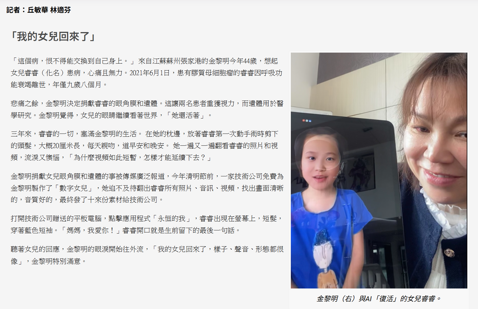 我們已成功協助中國超過3000個家庭完成「數位重現」家人的案例,並曾接受中國官方媒體-中央電視台、浙江衛視,及美國媒體CNN、麻省理工大學MIT等國內外機構及媒體專訪。